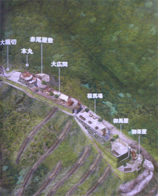 右から、御茶屋、御馬屋、桜馬場、大広間、赤尾屋敷、本丸、堀切、