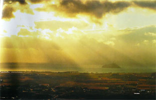 その向うに琵琶湖が拡がり、「霊所・竹生島」が可愛らしい姿を見せ、