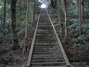 秀吉は、感心する一同を見て、 家康は、この笑談を、しっかり覚えていた。 家康は、秀吉直伝の作戦のまんま、 「大坂・冬の陣」後の和議に利用したのである。 もし、その酒宴で、秀吉の真横にいた淀殿が、 この戯れ言を、真剣に聴き、覚えていれば、 家康の術中に、嵌ることもなかっただろう。 秀吉の墓・「豊国廟」 阿弥陀ヶ峰中腹にある秀吉の墓・大五輪塔に着くまで、 豊国廟参道ー