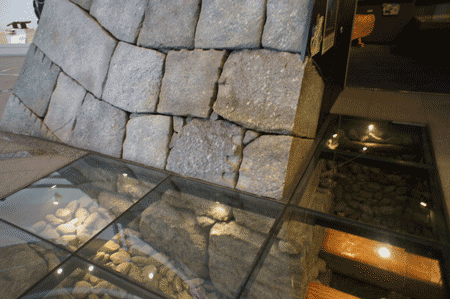 高槻城の石垣基礎 右下の3つのみが実際に発掘された石垣石。