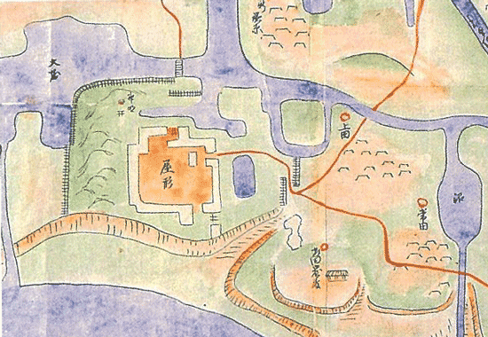 水路を巧みに利用して防備を固めていたことがわかる。特に図の下側の