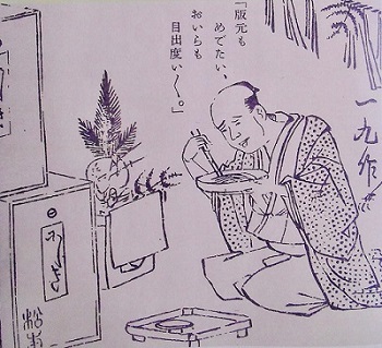 この絵は、十返舎一九作の草紙が大人気、版元から品物を担いで向かう世利