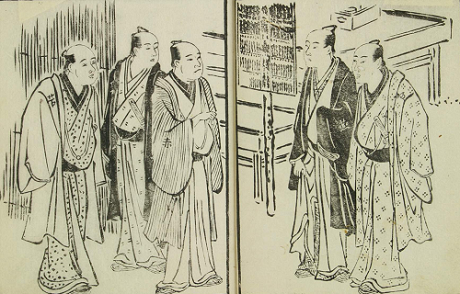 右から、蓬莱山帰橋、四方赤良、清水燕十、朝倉雲楽斎、朱楽菅江、