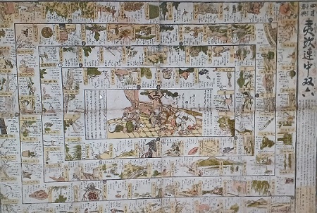 『夷歌連中双六』(歌麿画) 天明5年の四方側の歳旦狂歌集は道中双六の体裁で出されている。 狂歌に遊んだ歌麿は「筆綾丸」の名で、蔦重こと「蔦唐丸」のものと並べて 右下に狂歌を寄せている。 戯作も浮世絵も、芝居や映画と同じで、ひとりでは作れない。