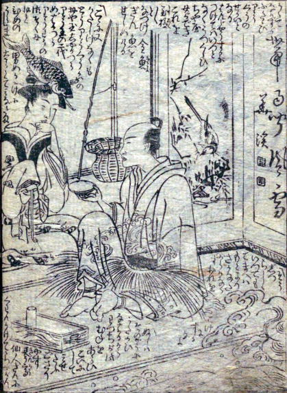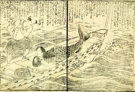漁師平次の舟に飛び込んできた浦島太郎と鯉の娘・人魚 山東京伝が蔦重のもとで寛政3 (1791) 年に刊行した黄表紙『箱入娘面屋人魚』