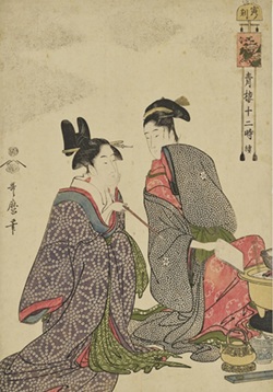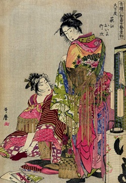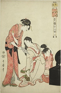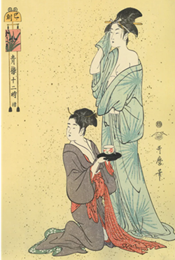 描かれているのは湯上りの遊女。お茶を差し出しているのは、見習い遊女(新