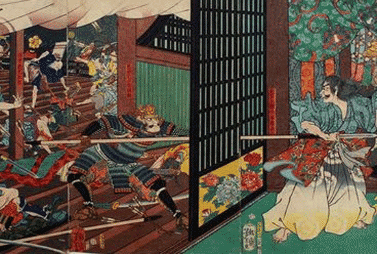 琵琶湖が満々と水をたたえる崖下へと身を躍らせた。