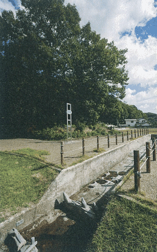 そのむこうにある穴が当時の堰き止め土俵跡、そばに当時の骨があった。