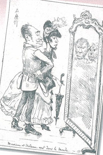 (風刺画ー履きなれない靴を脱ぎ捨てている。 鏡に映った紳士淑女が猿と犬になっている)