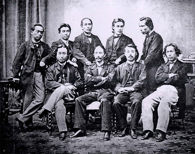 前列右端が西周、後列中央に榎本武揚の姿が見える。