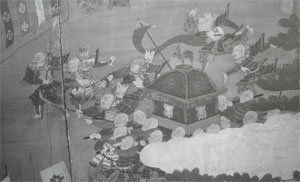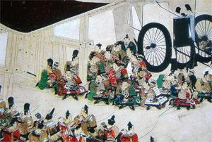 不安と悲観が世を覆うなか、 寺院による示威行為(強訴)も頻発しはじめる。 強訴の屏風 強訴を起した延暦寺や興福寺などは、 天皇の安穏や国家鎮護のために、創建されたものであり、 国が経営していた。 しかし、財政が厳しくなると、寺院に与える財源が減り、