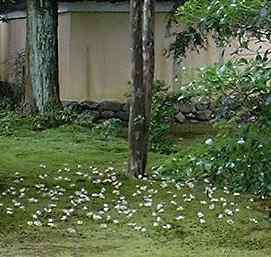 枝に開け庭に散る花を見、