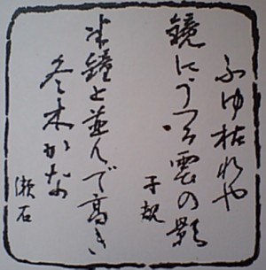 高浜虚子句(下村為山画) 子規逝くや十七日の月明に 高浜虚子 子規は高浜虚子を、後継者と考えていた。 文学を志すといいながら、高校への入退学を繰り返し、 同級生の河東碧梧桐とつるんで、遊び暮している虚子に、 苛立ちを覚えながら、愛情をもって接している。 後継の話を持ち出したのは、 子規の脊椎カリエスが発見されて、直後のことだった。 芋阪の団子の起り尋ねけり(明治31年) 文政2年(1819)創業の老舗の団子屋の団子・餡と焼き ≪子規や漱石のはか、田山花袋、岡倉天心、泉鏡花らも愛好した≫ 子規は、道灌山にある茶店で駄菓子を勧めながら、 「学問をして自分の跡を継げ」 「好意に背くことは忍びんことであるけれども、自分の性行を曲げることは、 私(あし)には出来ない」 と言うものだった。 虚子は飄然としていながら、妙に我の強いところがある。 こうして後継の話は立ち消えになったが、子規の愛情は変わらなかった。 漱石が来て虚子が来て大三十日(おおみそか)(明治28年) ≪だが少し後に、柳原極堂が松山で発行していた俳諧誌『ホトトギス』を、 東京で引き取ることになり、編集責任者となった虚子は、 「子規をしのぶ」 伊予松山という佐幕の小藩出身者では、子規や真之のような才幹であっても、 中央で驥足(きそく)を展ばせないのは、目に見えていた。 しかし、歴史とは大きな偶然でもある。 子規と真之の偉いのは、思わぬ偶然から、文学と海軍の世界に進む道が、 分かれながら、ひたすら、「近代日本のために、何事かをなさん」 とする、健気な青春をてらいなく過ごした点にある。 初日さす硯の海に波もなし(明治26年) 子規は西洋嫌いの祖父の命令で、まげ姿で小学校に通っていた。(明治7年) 上京して2年後、初めて帰郷した際に母と記念写真。(明治18年) 19歳、第一中学校予科(東京大学予備門)の制服姿。(明治20年) 茶の花や利休の像を床の上(明治20年) ≪旧松山藩の子弟のために、旧藩主の久松家が建てた寮≫ 『常磐会寄宿舎2号室(子規の部屋)は、坂の上にありて、 家々の梅園を見下ろし、いと好(よ)きながめなり』 坂の上の雲ー(1) (ここは、元・坪内逍遥の家で、坂の下には、樋口一葉が住んでいた) 大学時代の子規は、俳句や短歌のほか、ベースボールにも熱中した。(明治22年) 鴬や東よりくる庵の春(明治25年) 幸せは今日も同じ顔に会う 野村増二 常磐会宿舎に4年間暮した後、根岸に移る。 名月や我は根岸の四畳半(明治26年) 俳句や短歌の革新を志した子規は、 激痛を伴う重病にかかりながら、 「もっともっと日本の夜明けのために、国民の啓発のために働きたい」 のに体が許さず、切ない思いに泣く子規。 子規は、海軍の若きエリートとして、 (しかし同時に友人の幸運を素直に祝福もしている) いくさかな我もいでたつ花に剣(明治28年) 子 規 堂 子規が17歳まで暮した住居を、正宗寺住職の仏海禅師が境内に復元した。 子供時代の子規の三畳の書斎や、子規が使用の机・遺墨・遺品・原稿など展示。 ≪入館料50円・・・とは、うれしい≫ 脊椎カリエスのために伸ばせない左膝を入れるために、机は特注している。 床の間には晩年の子規を描いた自画像を展示している。 樽柿を握るところを写生かな(明治35年) 「子規と漱石」 日露戦争を描く『坂の上の雲」の登場人物に、 司馬遼太郎は、なぜ漱石でなく、子規を選んだのでしょう。 本来ならば、漱石こそが適役のはず。 なにしろ子規は、日露戦争の前に死んでしまうのですから。 実際、ロンドン留学中の漱石は、1902年の”日英同盟締結”を現地で知り。 ヴィクトリア女王の葬儀と、 月のかけらも皿のかけらも物議あり 荒井慶子 漱石は、「坂の上の雲」のなかでは、表立った存在感を示していない。 子規の友人として、間接的に物語に登場し、文学を志しながら、 軍人への道に転じた真之との対比で語られるだけだ。 20世紀的国際情勢をロンドンで肌身にしみて感じとり、 日本の立場を思いやったのは、漱石なのである・・・が。 ≪ロンドンにて子規の訃を聞き、虚子よりの要求で書いた追悼句≫ ドラマ性も、ニュース性も、併せ持った漱石が、 三人目の登場人物としていれば、 また違ったロマンのある物語が生れたのではないかと思うのである。 ≪小説のなかの子規は、何度も真之に漱石を紹介しようとするが、 不思議なことに間が悪く、この二人は最後まで邂逅することはない≫ 母・八重(右)と妹・律(左) ≪子規の死後、叔父・加藤拓川の息子・忠三郎を養子にして家を継がす≫ いもうと律は、どれだけ子規の支えだったか。 ”坂の上の雲”NHKのドラマでも、律の健気に泣かされる。 母と二人いもうとを待つ夜寒かな(明治34年) いもうとの帰り遅さよ五日月(明治34年) 覚悟してこっそり落ちた寒椿 早泉早人 「子 規 庵」 (空襲で焼失ー昭和25年再建) 子規が亡くなるまで、10年間住んだ旧前田候下屋敷の長屋。 ≪愛用の机は、伸ばせなくなった左足を入れるため、一部がくりぬかれている。 庭の土蔵には硯や筆、衣服な