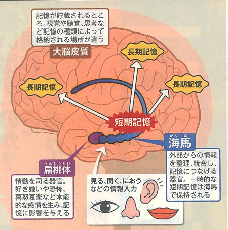 目、耳など感覚器官や思考を通じて入ってきた情報は、脳内の「海馬」