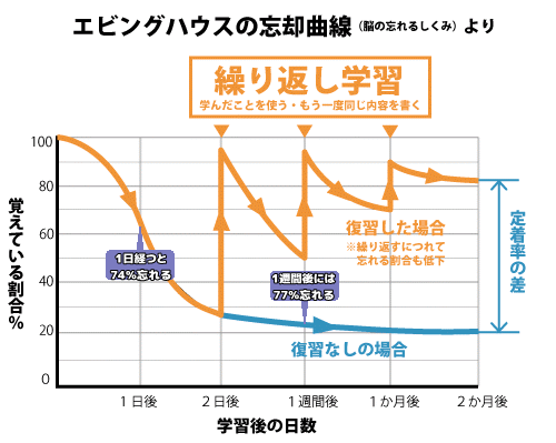 覚えたことは20分ごに42%も忘れてしまうが、復習を行い、