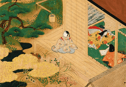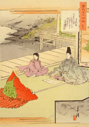 薫と僧都と小君 法の師と たづぬる道を しるべにて 思はぬ山に 踏み惑ふかな 横川の僧都を、仏道や心の師と仰いで訪ねてきた道ですが、 思いがけない恋の山道に迷い込んでしまったようです。 「巻の54 【夢浮橋】」 薫は明石中宮が言っていた浮舟生存の話を確かめるため、 浮舟の弟である少年の小君を連れて、横川の僧都を訪ねた。 そこで薫は、僧都から浮舟の様子を聞き、浮舟に違いないと思った薫は、 「私が心を寄せていた人で、突然、消息を絶ち訳も判らず葬儀を してしまった人がいます。それが尼君のお世話になっている人です。 きちんと確認できたら、母親はじめ家族に合わせてあげたいのです」 と言う。 恋してるうちに雨は本降りに 森田律子 それを聞いた僧都は、深く考えず浮舟を出家させてしまったことを悔む。 が、引き合わせて欲しいという薫の要望は、頑として受け入れなかった。 一度出家した者を破壊者(戒律を破る者)にする訳にはいかないからである。 そこで薫は、僧都に事情を記した手紙を書いてもらい、 「お前の姉様は、死んだと諦めていたのだが、生きておられたんだよ。 姉様は他の人には、知られたくないと思われているようだから、 お前が行って、この手紙を渡してきておくれ」 と言って手紙を小君に託す。 翌日、小君は僧都と薫の二つの手紙を持って小野の庵を訪ねた。 夜桜の優しさごっこ受け入れる 前中知栄 浮舟への手紙を書く僧都 簾越しに弟の姿を見た浮舟は、動揺をしていた。 門前にいる小君は、自殺の決心をした夜にも、恋しいと思った弟である。 一緒に住んでいた頃は、まだ腕白で、両親の愛に驕って憎らしかったが、 宇治へもよく遊びにきて、姉弟の愛を感じ合うようになっていた。 逢いたい、会って、何よりも母がどうしているのかと聞きたい。 他の人々のことについては、誰からともなく噂を耳にはするが、 母の消息は知ることができなかった。 それを思うと、目の前にいる弟を見ていると、何とも悲しくなり、 浮舟は涙をおさえられなかった。 左手の手袋ばかり見失う 三村一子 尼君は小君と話すように促すが、浮舟は首を横に振らない。 本心は弟に母の様子を聞きたくてたまらないが、 出家した身だからと強く自制して「人違いだ」と言い張って、 顔を見せることすら拒み続けた。 仕方なく尼君が対応に出て、僧都の手紙を受け取る。 薫からの手紙は受け取るものの、浮舟は見ようとしないので、 尼君が開いて浮舟に手渡した。 紙の匂いは昔のままで芳ばしく、薫の懐かしい筆跡に涙が零れる。 のぞき見をして風流好きな尼君は、美しいものと思った。 僧都の方の手紙には「薫の執着心を取り除いてあげなさい」とある。 過去のことを知らない尼君は、その手紙を見て、薄々事情を知る。 耳掃除ばかりしている春の欝 笠嶋恵美子 夢見心地に姉を待つ小君 泣いてひれ伏したままの浮舟の様子に尼君は困って、 「折角来てくれた弟さんに どう返事をすればいいのです」 と浮舟を責めると、 「今は気持ちも落ち着かず、心がかき乱されています。 それに昔のことを思い巡らせても、思い当たることがありません。 落ち着きましたら手紙の意味が分かることもあるでしょう。 ひょっとして手紙の受け取り人が、違っていたりしては迷惑なことです。 このまま手紙を持って帰らせてください」 と浮舟は言い、手紙は拡げたままで尼君のほうへ押し返した。 ひらり来てひらりと去った冬螢 合田瑠美子 尼君はふたたび小君の話し相手に出て、 「物怪の仕業でしょうかね。お姉様はずっと御病気続きでね。 わざわざご主人様も近くに来ていらっしゃるというのに、 碌な返事もできずお詫びのしかたもないのですよ」と言う。 小君は姉に再会できる喜びを心に抱いて来たが、落胆して帰ることにした。 薫は小君の帰りを今か今かと待っていたが、 しょげて帰ってきた小君の様子から、ことを察した薫は、 文を出さねばよかったと気落ちし、自分がかつてそうしたように、 誰かが浮舟をかくまっているのではないかと思い悩むのだった。 少しおしゃまなフライングして青蜜柑 美馬りゅうこ 【辞典】 最後に 「夢浮橋」は、源氏物語最終話で宇治十帖の締めくくりの巻になります。 この宇治と言う地名は、<わがいほは 都のたつみ しかぞすむ 世をうぢ山と ひとはいふなり>という歌を喜撰法師が詠んで以来、「憂し」を連想させる 地として知られるようになります。その憂愁のイメージはこの宇治十帖全体 特に政治の内紛に巻き込まれ没落した八宮や、いつまでも思い悩む薫の心の 様にリンクして物語に重量感を与えています。また、この物語は、この後に どのようなことが起こるのかを明確には示さず、読者の想像にゆだねる形の 終わり方をしています。それを「開けたままの終結」と呼ぶますが夢浮橋は 作者の紫式部が意図して「開けたままの終結」にしたと伝えられています。 トクトクトクはーといつしか琥珀色 雨森茂樹 源氏物語はこれにて終